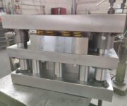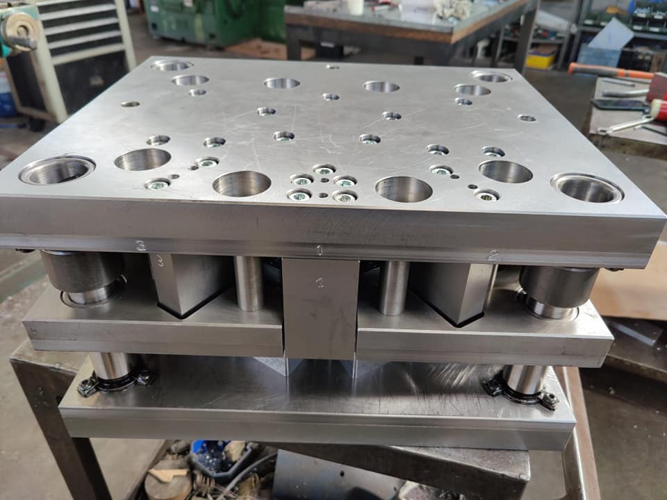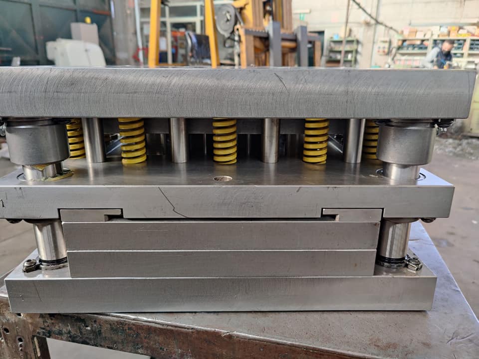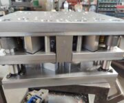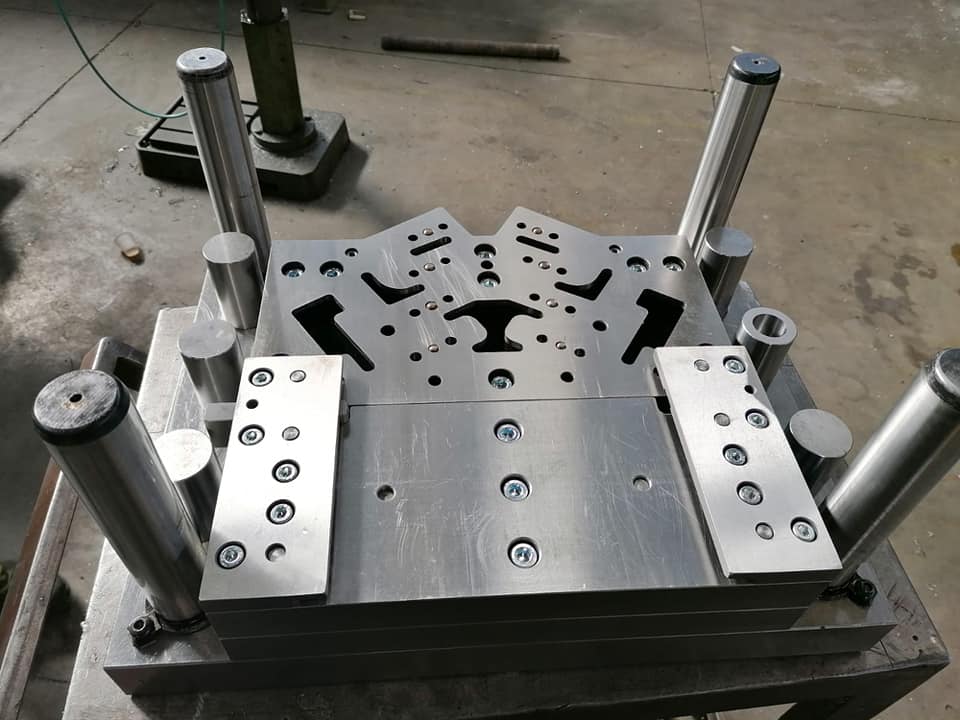 Descrizione: Stampi tranciatura lamiera in accordo alle esigenze del cliente per trasformare la lamiera in ogni genere di forma e struttura. In particolare, questo modello è a passo per la realizzazione di due figure, destra e sinistra con pieghe. Spessore 40/10.
